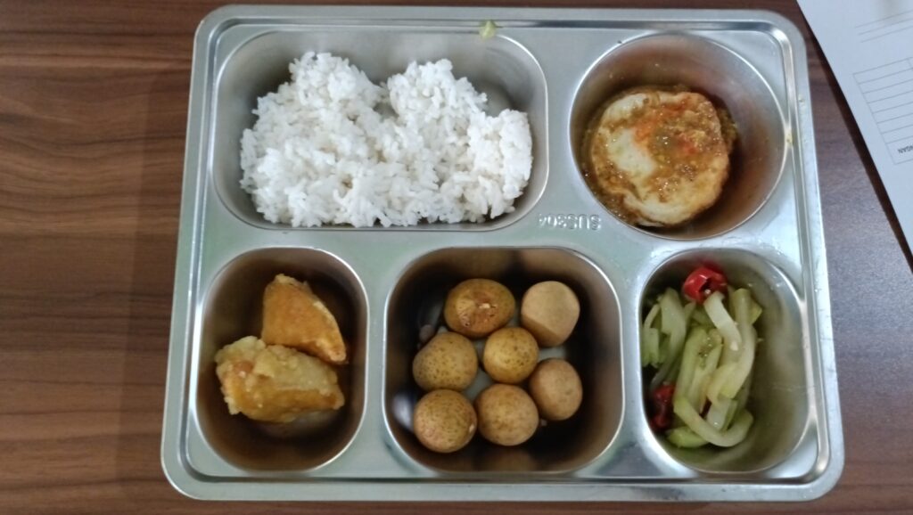 Sebelum tray dibagikan kepada murid, dilakukan terlebih dahulu test food, dengan memberikan penilaian dari bau, warna, rasa, tekstur dari nasi, telur, tahu, sayur dan buah yang disajikan hari ini. Penilaian yang kami berikan dengan nilai 4, bermakna suka.