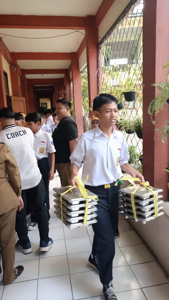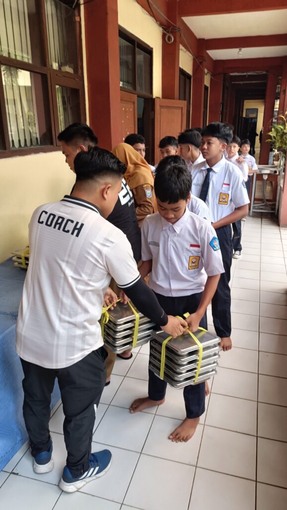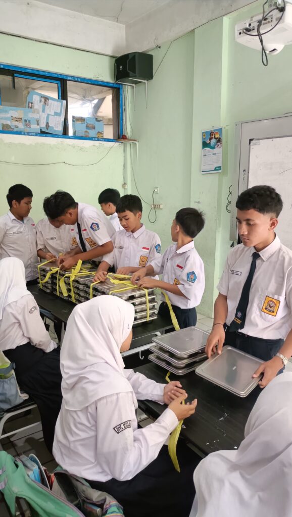 Setelah penilaian test food didistribusikan ke murid, perwakilan setiap kelas sebanyak 4 orang, untuk mengambil tray di setiap pos Kelas 7, Kelas 8 dan Kelas 9.
